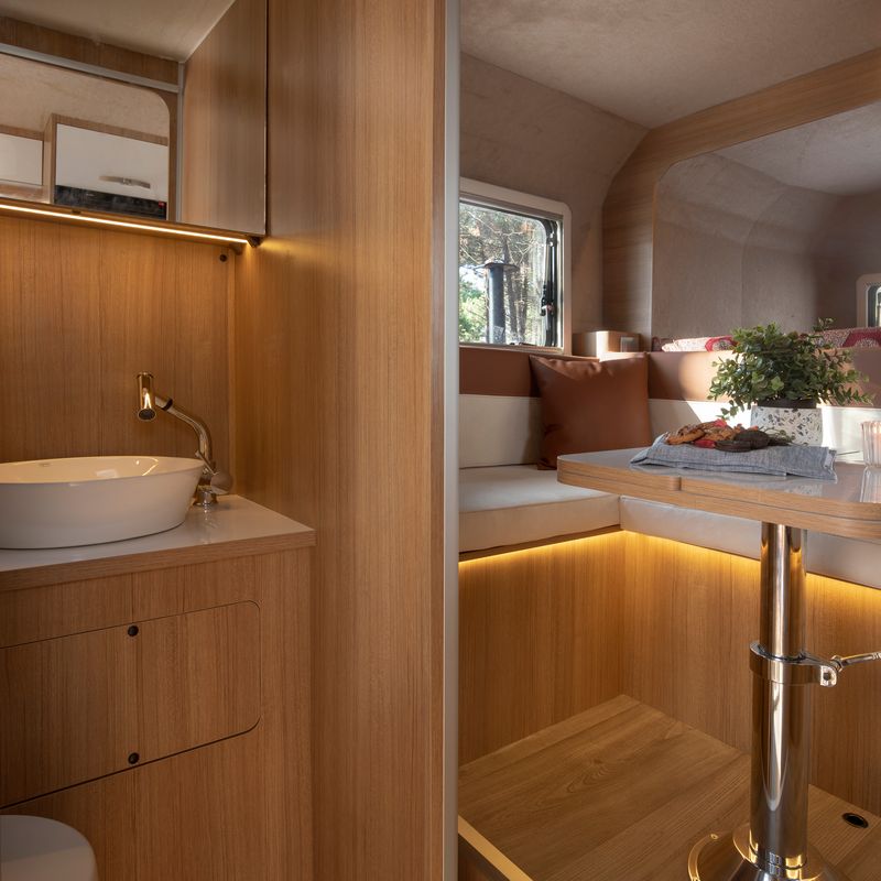 Gladiator L offers a thoughtfully designed interior with a wide double bed, convertible seating area, and optimized storage. The extended bathroom and kitchen make long stays both practical and comfortable — even for a family of five.